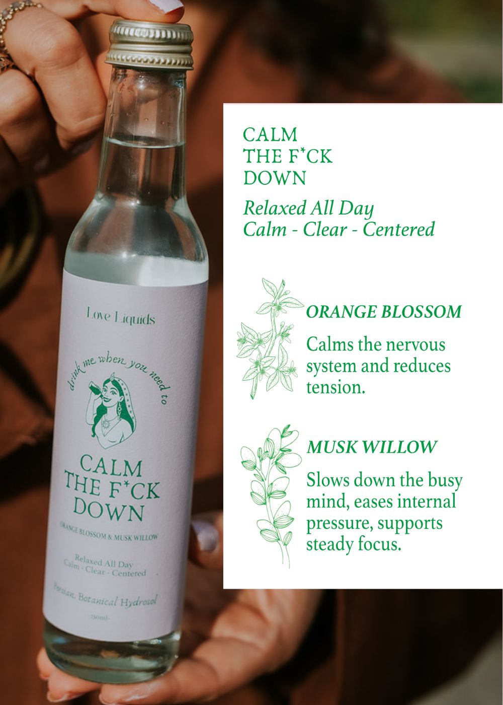 Ingredients:  60% Orange blossom water (distilled Citrus aurantium) and 40% Musk Willow water (distilled Salix aegyptiaca catkins).