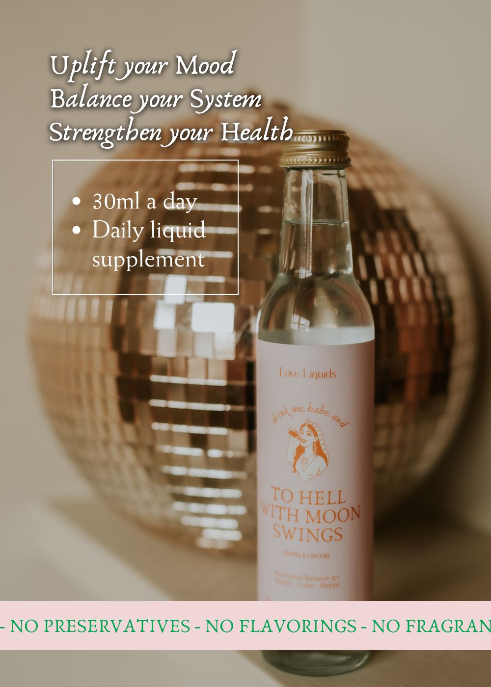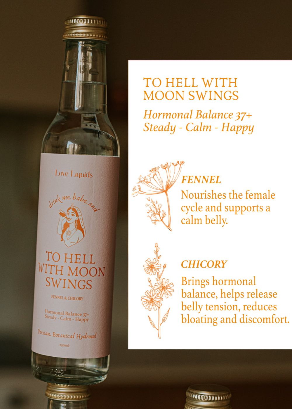 Ingredients:  60% Fennel water (distilled Foeniculum vulgare seeds) and 40% Chicory water (distilled Cichorium intybus herbs).